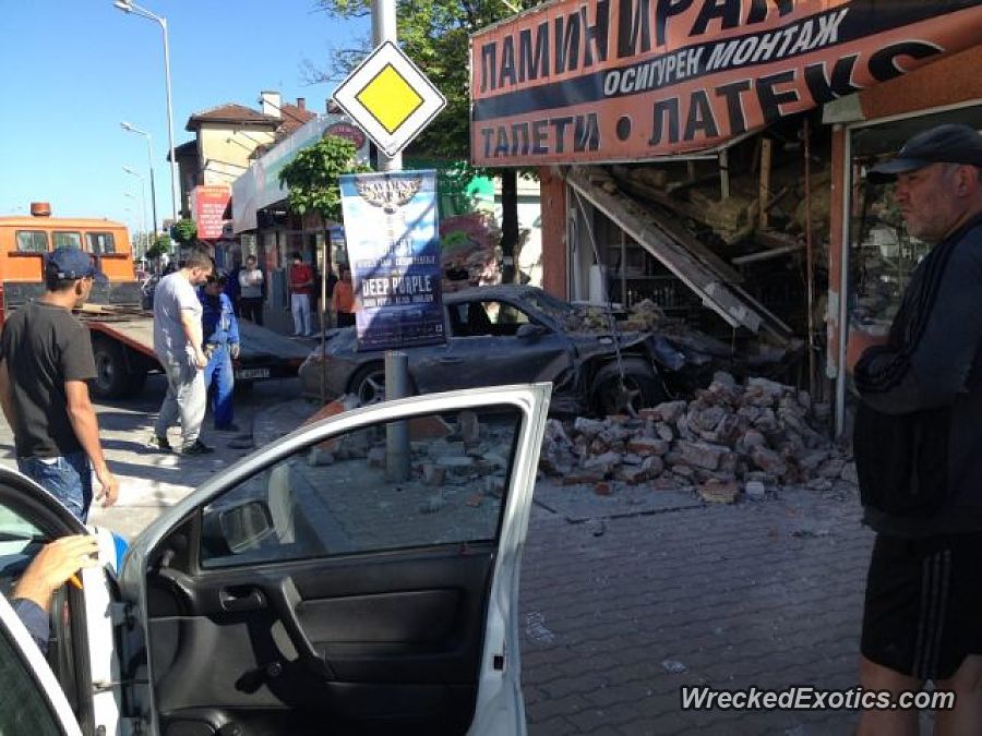 The driver crashed into a store after colliding with another vehicle.