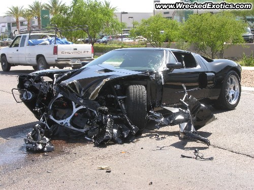 This is what happened in the wreck. The valet for the repair shop went FULL THROTTLE in the 550 HP Ford GT in a 90 degree right turn onto Scottsdale Road in full traffic at around 3:00 pm. Dummy, right??? The kid was about 21-25 years old. He lost control, and got the front part of the car under a DUMP TRUCK on the opoosite side of traffic. The REAR AXLE of the dump truck popped in the air about 2 feet off the ground. The car was COMPLETELY TOTALED. It cannot be brought back a second time, as there is much more damage than the first time. I can't imagine what they had to explain to the owner of the Ford GT.