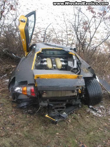 Details on this crash are sketchy, but rumor has it that this is a prototype 2007 Murcielago which crashed during testing. It hit a guardrail on the highway and rolled over.