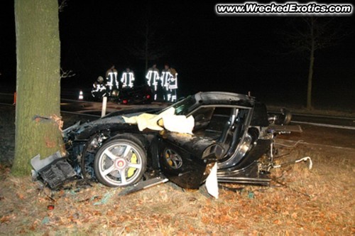 This is the worst Porsche Carrera GT wreck so far and the story behind it is very odd. A couple had just befriended the owner of the Porsche at a resort. The owner allowed the couple to "test" drive his car. The woman took the driver's seat and her boyfriend/husband sat in the passenger seat. Within 1 mile of starting the test drive, the woman lost control and crashed into a couple of trees, tearing the car in half. She suffered severe injuries while the man walked away from the accident.