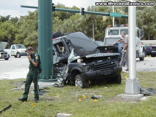 A Lexus made an illegal left turn striking driver's side of the Range Rover causing it to roll and strike a traffic control pole roof first. It was tightly wrapped around the pole and had to be pulled off before bodies could be removed.