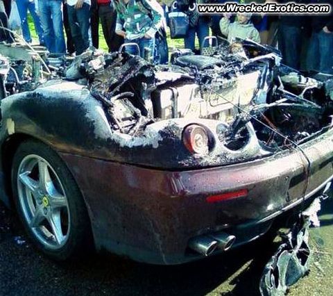 The owner of this Ferrari had just purchased the car for $750,000. 30 minutes later, he noticed some smoke coming out from under the hood. The car caught fire and was completely destroyed.