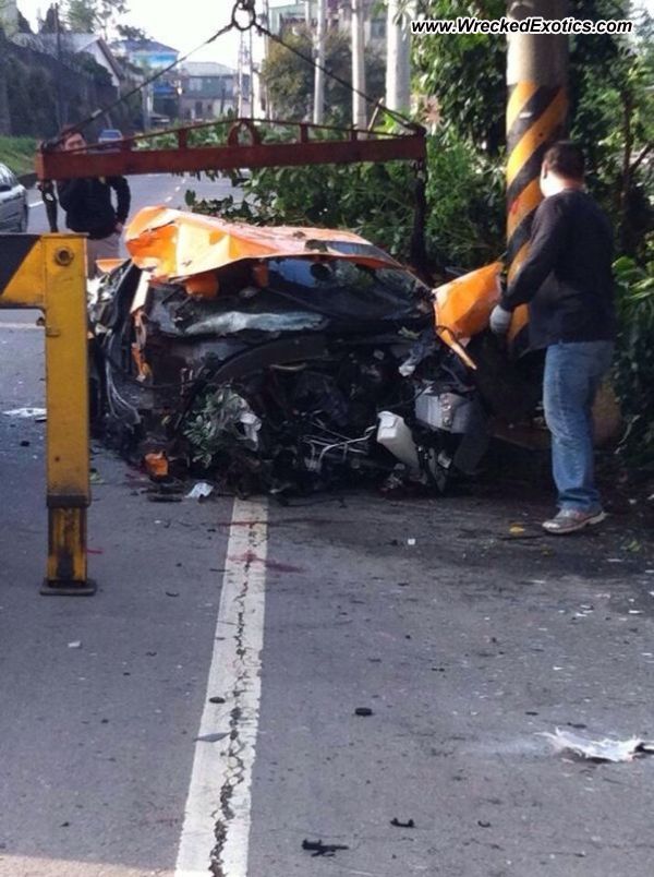 Driver of this 2011 McLaren MP4-12C lost control while speeding, hit a concrete power pole and completely destroyed the passenger side, then smashed into another power pole on the other side of the street. Driver was hospitalized, and the car was totaled. This happened on December 8th, 2013.