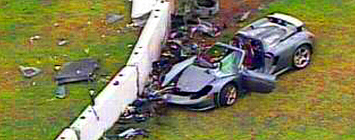 "The car suddenly turns right on the Autobahn which is straight, dry and in quite good condition with hardly any traffic, and after a very fast 90 degree turn goes through the guard rail and then lands with the top down in a forest about 150 meters from the place where the guard rail was broken through. The possibility of a tire failure is being eliminated by experts, also the road was in good condition and no hindrances."